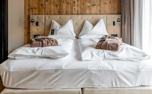 Værelse på ca. 50 m2 med plads til 2 personer indrettet med dobbeltseng, dobbelt sovesofa, badeværelse med bruser og balkon. Ved forespørgsel kan man få værelse med eget steam room og/eller udendørs jacuzzi.